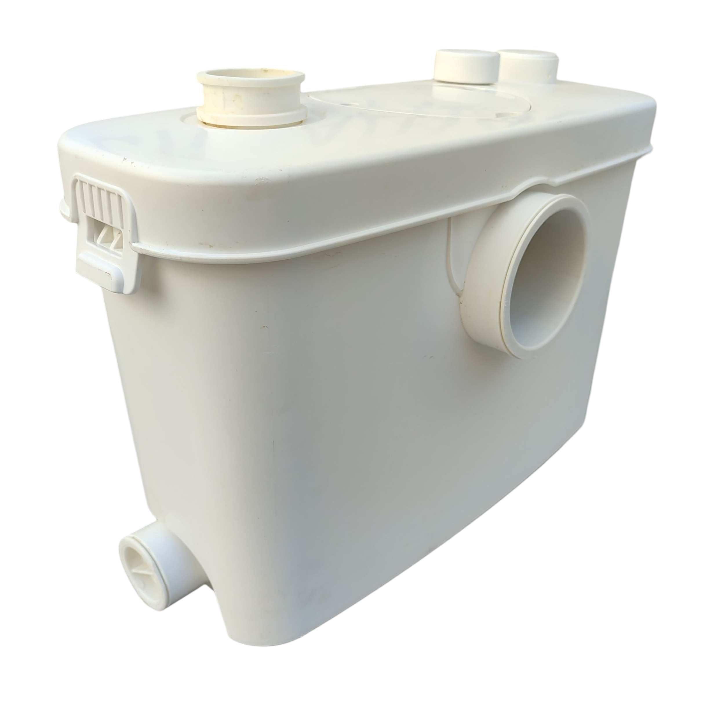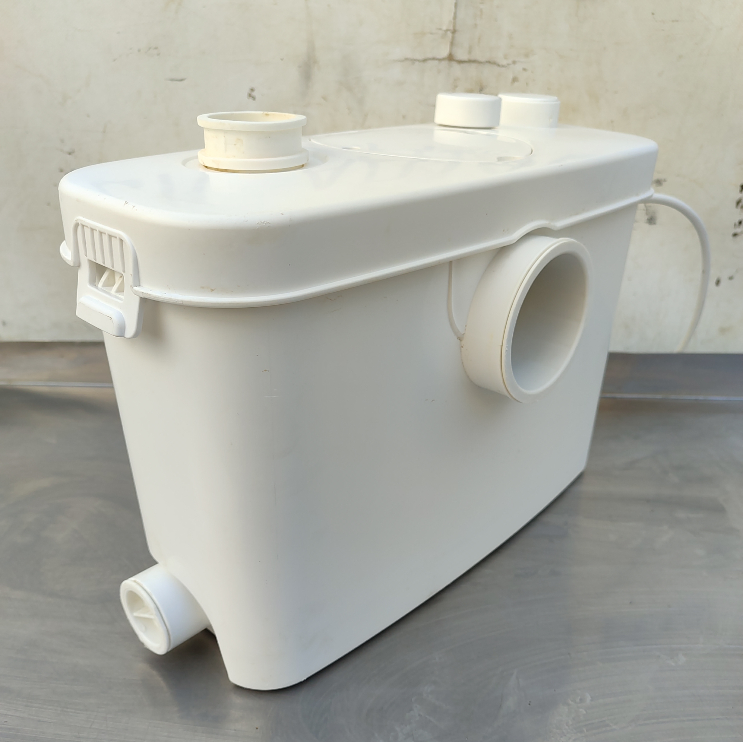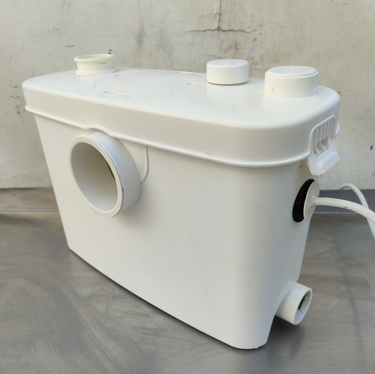 КНС оснащена фекальным насосом с измельчителем из нержавеющей стали и поплавковым механизмом для автоматического включения/выключения. Насос имеет термозащиту от перегрева. Установка выполнена из легко моющегося пластика. Имеет один основной вход Ø100 мм для унитаза, два отверстия (Ø40 мм) для других приборов и один опциональный вход. Выходное отверстие оборудовано обратным клапаном (патрубок 23/28/32/44 мм).